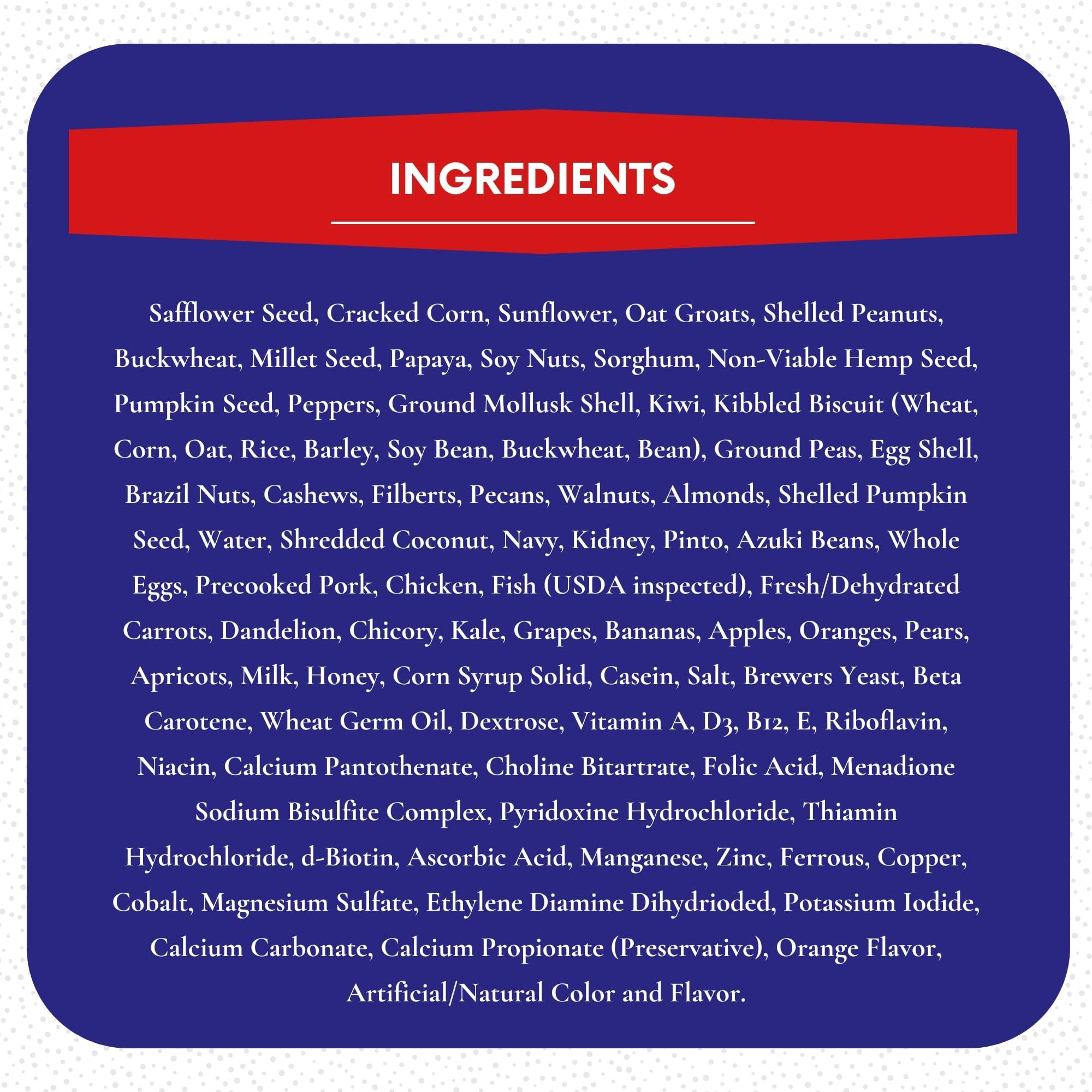Diverse Protein and Fiber Sources: ABBA bird seed fruit and nut blend features pumpkin seeds, mollusk shells, kibbled biscuits, and fiber-rich legumes like navy, kidney, pinto, and azuki beans, promoting healthy digestion and muscle development.