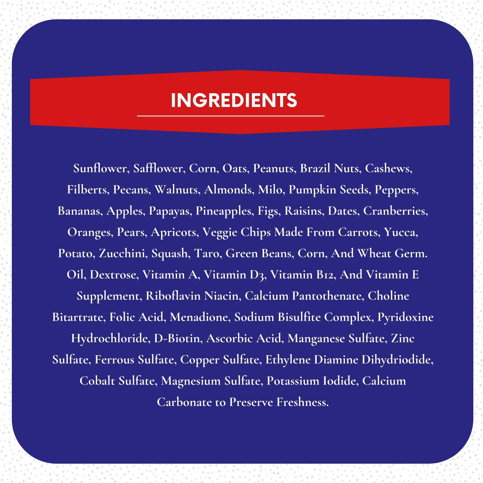 Sunflower, safflower, corn, oats, peanuts, Brazil nuts, cashews, filberts, pecans, walnuts, almonds, milo, pumpkin seeds, peppers, bananas, apples, papayas, pineapples, figs, raisins, dates, cranberries, oranges, pears, apricots, veggie chips made from carrots, yucca, potato, zucchini, squash, taro, green beans, corn, and wheat germ. Oil, dextrose, vitamin A, vitamin D3, vitamin B12, and vitamin E.