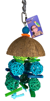 - Bird-Safe materials: our Shelly-Fish for birds is made of coconut shell, human grade food colored wood and vine balls, tied together by a paper rope.