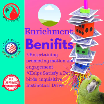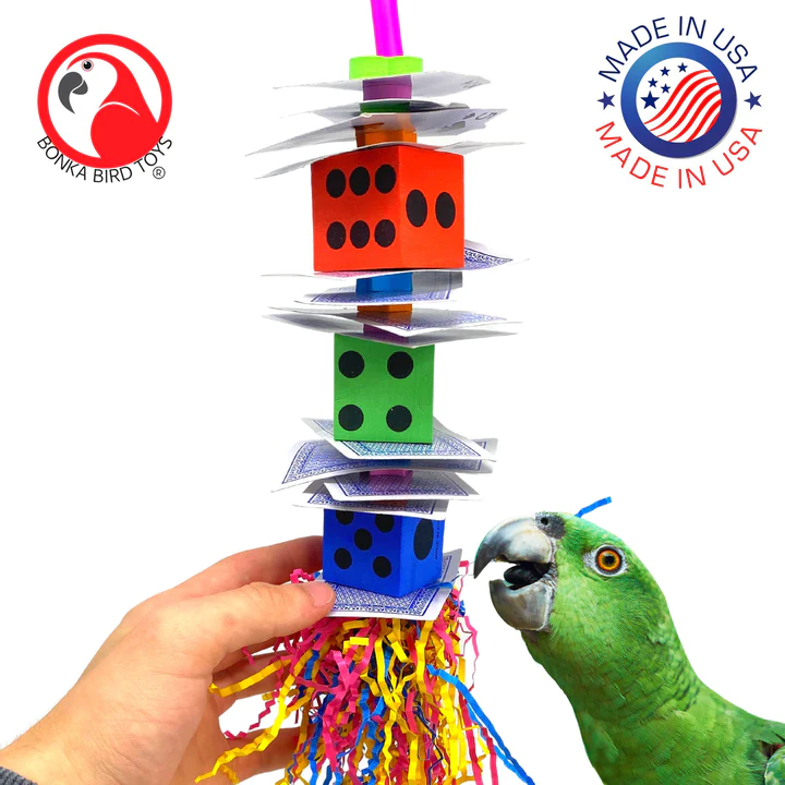 Poker Dice an all around chew and shred toy for your small to medium-sized feathered friends, they will love to climb all over this poker-faced toy. Large foam dice are assorted with colored foam shapes, colorful sports playing cards and finished at the top with crinkly cut colored paper. Measures approximately 10 inches high by 2 inches wide. Comes complete with a quick link attachment for easy cage placement.