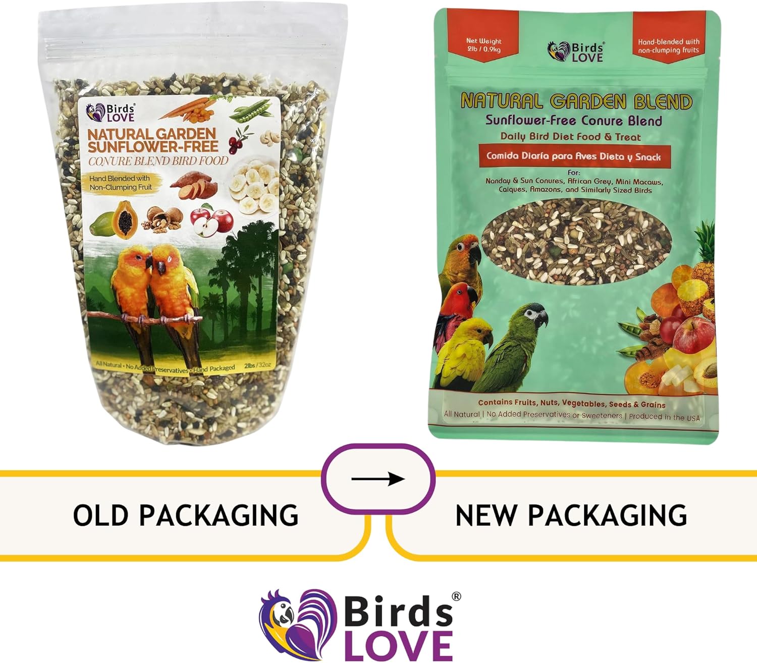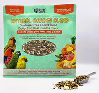 Like all our Natural Garden Blends, Natural Garden Conure is a top of the line premium blend. It consists of nuts, fruit, vegetables and some seeds and grains. This blend is targeted to birds that fall between medium and large birds. These include conures, quakers, small african greys and molucan cockatiels. This is a daily blend that your birds will love and fits all of their nutritional needs.