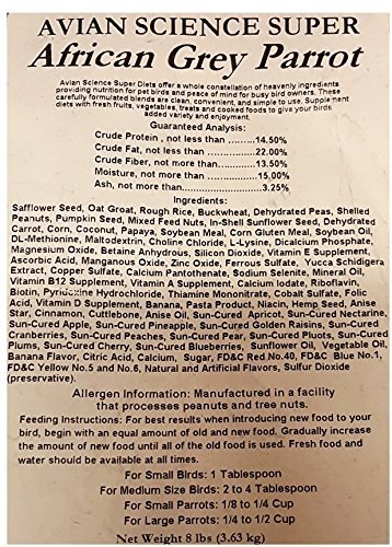 Volkman Avian Science Super African Grey Parrot & Amazon Parrot Food is a special blend that’s formulated for the specific dietary needs of African Greys and Amazon Parrots. This mix of flavorful foods is packed fresh and is full of delicious seeds, nuts and veggies plus a medley of fruit, including apples, peaches, cherries, papayas, cranberries, pears, plums and blueberries. It’s been triple cleaned to eliminate dust for a clean, pure bird food. Cuttlebone is added to supply needed calcium, along with vitamins and minerals for a nutritious and balanced assortment.
